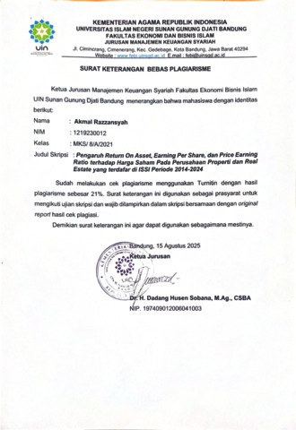Razzansyah, Akmal (2025) Pengaruh Return On Asset (ROA), Earning Per Share (EPS) dan Price Earning Ratio terhadap Harga Saham pada perusahaan Property dan Real Estate yang terdaftar di Indeks Saham Syariah Indonesia (ISSI) selama periode 2014-2024. Sarjana thesis, UIN Sunan Gunung DJati Bandung.