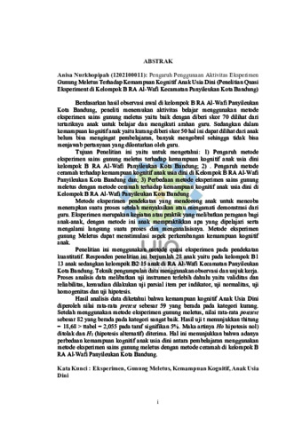 Berdasarkan hasil observasi awal di kelompok B RA Al-Wafi Panyileukan Kota Bandung, peneliti menemukan aktivitas belajar menggunakan metode eksperimen sains gunung meletus yaitu baik dengan diberi skor 70 dilihat dari tertariknya anak untuk belajar dan mengikuti arahan guru. Sedangkan dalam kemampuan kognitif anak yaitu kurang diberi skor 50 hal ini dapat dilihat dari anak belum bisa mengingat pembelajaran, banyak mengobrol sehingga tidak bisa menjawab pertanyaan yang dilontarkan oleh guru. Tujuan Penelitian ini yaitu untuk mengetahui: 1) Pengaruh metode eksperimen sains gunung meletus terhadap kemampuan kognitif anak usia dini kelompok B RA Al-Wafi Panyileukan Kota Bandung; 2) . Pengaruh metode ceramah terhadap kemampuan kognitif anak usia dini di Kelompok B RA Al-Wafi Panyileukan Kota Bandung dan; 3) Perbedaan metode eksperimen sains gunung meletus dengan metode ceramah terhadap kemampuan kognitif anak usia dini di Kelompok B RA Al-Wafi Panyileukan Kota Bandung Metode eksperimen pendekatan yang mendorong anak untuk mencoba menerapkan suatu proses setelah menyaksikan atau mengamati demonstrasi dari guru. Eksperimen merupakan kegiatan atau praktik yang melibatkan peragaan bagi anak-anak, dengan metode ini anak mempraktikkan apa yang dipelajari serta mengalami langsung suatu proses dan menganalisisnya. Metode eksperimen gunung Meletus dapat menstimulasi aspek perkembangan kemampuan kognitif anak. Penelitian ini menggunakan metode quasi eksperimen pada pendekatan kuantitatif. Responden penelitian ini berjumlah 28 anak yaitu pada kelompok B1 13 anak sedangkan kelompok B2 15 anak di RA Al-Wafi Kecamatan Panyileukan Kota Bandung. Teknik pengumpulan data menggunakan observasi dan unjuk kerja. Proses analisis data melibatkan uji instrumen terlebih dahulu yaitu validitas dan reliabilitas, kemudian dilakukan uji parsial item per indikator, uji normalitas, uji homogenitas dan uji hipotesis. Hasil analisis data diketahui bahwa kemampuan kognitif Anak Usia Dini diperoleh nilai rata-rata pretest sebesar 59 yang berada pada kategori kurang. Setelah menggunakan metode eksperimen gunung meletus, nilai rata-rata posttest sebesar 82 yang berada pada kategori sangat baik. Hasil uji t menunjukkan thitung = 18,68 > ttabel = 2,055 pada taraf signifikan 5%. Maka artinya Ho hipotesis nol) ditolak dan H1 (hipotesis alternatif) diterima. Hal ini menunjukkan bahwa adanya perbedaan kemampuan kognitif anak usia dini antara pembelajaran menggunakan metode eksperimen sains gunung meletus dengan metode ceramah di kelompok B RA Al-Wafi Panyileukan Kota Bandung.