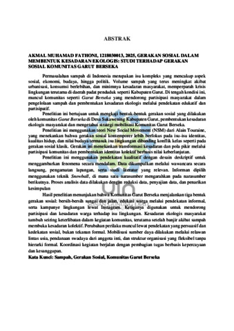 Permasalahan sampah di Indonesia merupakan isu kompleks yang mencakup aspek sosial, ekonomi, budaya, hingga politik. Volume sampah yang terus meningkat akibat urbanisasi, konsumsi berlebihan, dan minimnya kesadaran masyarakat, memperparah krisis lingkungan terutama di daerah padat penduduk seperti Kabupaten Garut. Di tengah kondisi ini, muncul komunitas seperti Garut Berseka yang mendorong partisipasi masyarakat dalam pengelolaan sampah dan pembentukan kesadaran ekologis melalui pendekatan edukatif dan partisipatif. Penelitian ini bertujuan untuk mengkaji bentuk-bentuk gerakan sosial yang dilakukan oleh komunitas Garut Berseka di Desa Sukawening Kabupaten Garut, pembentukan kesadaran ekologis masyarakat dan mengetahui strategi mobilisasi Komunitas Garut Berseka. Penelitian ini menggunakan teori New Social Movement (NSM) dari Alain Touraine, yang menekankan bahwa gerakan sosial kontemporer lebih berfokus pada isu-isu identitas, kualitas hidup, dan nilai budaya termasuk isu lingkungan dibanding konflik kelas seperti pada gerakan sosial klasik. Gerakan ini menekankan transformasi kesadaran dan pola pikir melalui partisipasi komunitas dan pembentukan identitas kolektif berbasis nilai keberlanjutan. Penelitian ini menggunakan pendekatan kualitatif dengan desain deskriptif untuk menggambarkan fenomena secara mendalam. Data dikumpulkan melalui wawancara secara langsung, pengamatan lapangan, serta studi literatur yang relevan. Informan dipilih menggunakan teknik Snowball, di mana satu narasumber mengarahkan pada narasumber berikutnya. Proses analisis data dilakukan dengan reduksi data, penyajian data, dan penarikan kesimpulan Hasil penelitian menunjukan bahwa Komunitas Garut Berseka menjalankan tiga bentuk gerakan sosial: bersih-bersih sungai dan jalan, edukasi warga melalui pendekatan informal, serta kampanye lingkungan lewat Instagram. Ketiganya digunakan untuk mendorong partisipasi dan kesadaran warga terhadap isu lingkungan. Kesadaran ekologis masyarakat tumbuh seiring keterlibatan dalam kegiatan komunitas, terutama setelah banjir akibat sampah membuka kesadaran kolektif. Perubahan perilaku muncul lewat pendekatan yang persuasif dan kedekatan sosial, bukan tekanan formal. Mobilisasi sumber daya dilakukan melalui relawan lintas usia, pendanaan swadaya dari anggota inti, dan struktur organisasi yang fleksibel tanpa hierarki formal. Koordinasi kegiatan berjalan dengan pembagian tugas berbasis kepercayaan dan kesanggupan.
