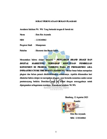 Aryanda, Ezra Rio (2025) Pengaruh Brand Image dan Digital Marketing terhadap Keputusan Pembelian Konsumen di Produk Tomkins pada PT Primarindo Asia Infrastructure Tbk di Kota Bandung. Sarjana thesis, UIN Sunan Gunung Djati Bandung.