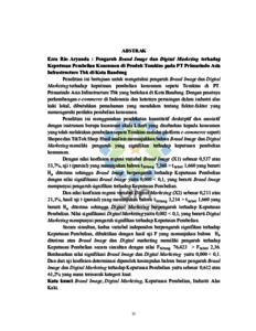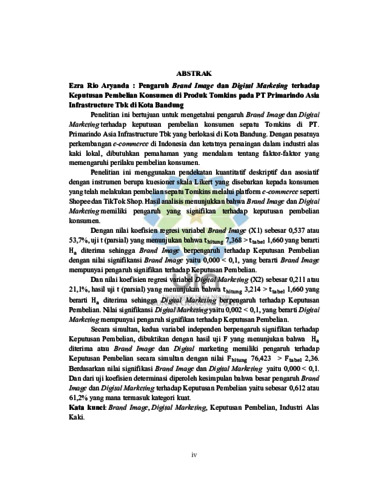 Penelitian ini bertujuan untuk mengetahui pengaruh Brand Image dan Digital Marketing terhadap keputusan pembelian konsumen sepatu Tomkins di PT. Primarindo Asia Infrastructure Tbk yang berlokasi di Kota Bandung. Dengan pesatnya perkembangan e-commerce di Indonesia dan ketatnya persaingan dalam industri alas kaki lokal, dibutuhkan pemahaman yang mendalam tentang faktor-faktor yang memengaruhi perilaku pembelian konsumen. Penelitian ini menggunakan pendekatan kuantitatif deskriptif dan asosiatif dengan instrumen berupa kuesioner skala Likert yang disebarkan kepada konsumen yang telah melakukan pembelian sepatu Tomkins melalui platform e-commerce seperti Shopee dan TikTok Shop. Hasil analisis menunjukkan bahwa Brand Image dan Digital Marketing memiliki pengaruh yang signifikan terhadap keputusan pembelian konsumen. Dengan nilai koefisien regresi variabel Brand Image (X1) sebesar 0,537 atau 53,7%, uji t (parsial) yang menunjukan bahwa thitung 7,368 > ttabel 1,660 yang berarti Ha diterima sehingga Brand Image berpengaruh terhadap Keputusan Pembelian dengan nilai signifikansi Brand Image yaitu 0,000 < 0,1, yang berarti Brand Image mempunyai pengaruh signifikan terhadap Keputusan Pembelian. Dan nilai koefisien regresi variabel Digital Marketing (X2) sebesar 0,211 atau 21,1%, hasil uji t (parsial) yang menunjukan bahwa thitung 3,214 > ttabel 1,660 yang berarti Ha diterima sehingga Digital Marketing berpengaruh terhadap Keputusan Pembelian. Nilai signifikansi Digital Marketing yaitu 0,002 < 0,1, yang berarti Digital Marketing mempunyai pengaruh signifikan terhadap Keputusan Pembelian. Secara simultan, kedua variabel independen berpengaruh signifikan terhadap Keputusan Pembelian, dibuktikan dengan hasil uji F yang menunjukan bahwa Ha diterima atau Brand Image dan Digital marketing memiliki pengaruh terhadap Keputusan Pembelian secara simultan dengan nilai Fhitung 76,423 > Ftabel 2,36. Berdasarkan nilai signifikasi Brand Image dan Digital Marketing yaitu 0,000 < 0,1. Dan dari uji koefisien determinasi diperoleh kesimpulan bahwa besar pengaruh Brand Image dan Digital Marketing terhadap Keputusan Pembelian yaitu sebesar 0,612 atau 61,2% yang mana termasuk kategori kuat.