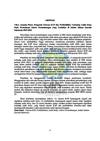 INDONESIA: Perusahaan sektor pertambangan yang terdaftar di ISSI masih menghadapi audit delay, terlihat dari perbedaan waktu penyelesaian audit antara perusahaan yang diaudit KAP besar dan KAP kecil, serta profitabilitas yang bervariasi namun tidak selalu diikuti ketepatan pelaporan. Secara teori, profitabilitas tinggi seharusnya mendorong percepatan publikasi laporan keuangan, dan KAP besar seharusnya mampu menyelesaikan audit lebih cepat karena dukungan sumber daya yang lebih baik. Namun, kenyataannya tidak semua perusahaan dengan profit tinggi mengalami audit yang lebih cepat sehingga muncul ketidaksesuaian antara teori dan realita, yang menjadi alasan perlunya penelitian mengenai pengaruh ukuran KAP dan profitabilitas terhadap audit delay pada perusahaan pertambangan ISSI periode 2019–2023. Penelitian ini bertujuan untuk mengetahui dan menganalisis: (1) pengaruh ukuran KAP terhadap audit delay pada perusahaan sektor pertambangan yang terdaftar di ISSI selama periode 2019–2023, (2) pengaruh profitabilitas terhadap audit delay pada perusahaan yang sama dalam periode tersebut, serta (3) pengaruh simultan ukuran KAP dan profitabilitas terhadap audit delay. Dengan mengkaji ketiga tujuan tersebut, penelitian ini diharapkan dapat memberikan pemahaman yang lebih mendalam bagi investor maupun manajemen perusahaan terkait faktor-faktor yang memengaruhi ketepatan waktu penyelesaian audit, sehingga dapat meningkatkan efektivitas pengambilan keputusan dan efisiensi proses pelaporan keuangan. Penelitian ini menggunakan metode deskriptif dengan pendekatan kuantitatif. Menggunakan data sekunder berupa laporan keuangan tahunan perusahaan pertambangan yang terdaftar di indeks saham syariah indonesi tahun 2019-2023. Sampel penelitian terdiri dari 10 perusahaan dengan total 50 observasi yang dipilih menggunakan metode purposive sampling. Teori yang digunakan menrupakan teori keagenan, teori kepatuhan, dan teori sinyal. Teknik analisis data dilakukan dengan uji statistik deskriptif, uji asumsi klasik, analisis regresi linear berganda, koefisien determinasi dan uji hipotesis menggunakan program IBM SPSS statistic 29. Hasil penelitian menunjukkan bahwa: (1) ukuran KAP berpengaruh negatif dan signifikan terhadap audit delay, (2) profitabilitas berpengaruh negatif namun tidak signifikan terhadap audit delay, dan (3) secara simultan, kedua variabel tersebut berpengaruh signifikan terhadap audit delay, yang berarti ukuran KAP dan profitabilitas bersama-sama dapat memengaruhi ketepatan waktu penyelesaian audit laporan keuangan. Companies in the mining sector listed on the Indonesia Sharia Stock Index (ISSI) continue to experience audit delays, as indicated by variations in audit completion times between firms audited by large and small public accounting firms (KAP), as well as differences in profitability that do not always correspond with timely reporting. Theoretically, high profitability should encourage faster publication of financial statements, and large audit firms are expected to complete audits more efficiently due to better resource capacity. However, in reality, not all highly profitable companies experience shorter audit completion times, creating a gap between theory and practice. This discrepancy forms the basis for examining the influence of audit firm size and profitability on audit delay among ISSI-listed mining companies during 2019–2023. ENGLISH: This study aims to analyze: (1) the effect of audit firm size on audit delay in mining companies listed in ISSI during 2019–2023, (2) the effect of profitability on audit delay in the same period, and (3) the simultaneous effect of audit firm size and profitability on audit delay. By addressing these objectives, the study is expected to provide deeper insights for investors and corporate management regarding the factors influencing audit timeliness, thereby improving decision-making effectiveness and the efficiency of financial reporting processes. The study employs a descriptive method with a quantitative approach, using secondary data from the annual financial statements of mining companies listed on the ISSI from 2019 to 2023. The sample consists of 10 companies (50 observations) selected through purposive sampling. Theoretical foundations include agency theory, compliance theory, and signaling theory. Data analysis techniques comprise descriptive statistics, classical assumption tests, multiple linear regression analysis, coefficient of determination, and hypothesis testing using IBM SPSS Statistics 29. The results indicate that: (1) audit firm size has a negative and significant effect on audit delay, (2) profitability has a negative but insignificant effect on audit delay, and (3) simultaneously, both variables significantly affect audit delay. This suggests that audit firm size and profitability together play a role in determining the timeliness of audit completion. ARABIC: تستمر الشركات العاملة في قطاع التعدين والمُدرجة في مؤشر الأسهم الشرعية الإندونيسي (ISSI) في مواجهة تأخيرات في عملية التدقيق، وذلك كما يظهر من اختلاف المدة الزمنية اللازمة لإكمال التدقيق بين الشركات التي يتم تدقيقها من قبل مكاتب محاسبة كبرى وصغرى، إضافة إلى تباين مستويات الربحية التي لا ترتبط دائمًا بالالتزام في تقديم التقارير المالية في الوقت المناسب. نظريًا، من المفترض أن تشجّع الربحية العالية على تسريع نشر التقارير المالية، وأن تكون مكاتب المحاسبة الكبرى أكثر قدرة على إنجاز التدقيق بسرعة نظرًا لتوفر موارد أفضل لديها. إلا أنّ الواقع يُظهر أن بعض الشركات ذات الربحية المرتفعة لا تحصل بال