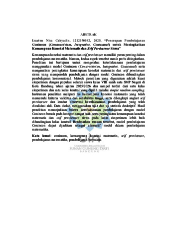 Cahyadin, Izzatun Nisa (2025) Penerapan pembelajaran Conincon (Constructivism, Integrative, Contextual) untuk meningkatkan kemampuan koneksi matematis dan self persistence siswa. Sarjana thesis, UIN Sunan Gunung Djati Bandung.