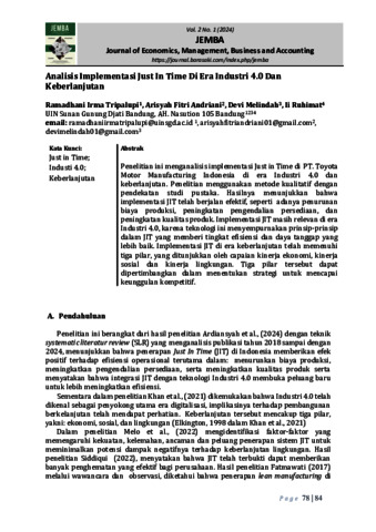 Tripalupi, Ramadhani Irma and Andriani, Arisyah Fitri and Melindah, Devi and Ruhimat, Ii (2024) Analisis implementasi Just In Time di era Industri 4.0 dan keberlanjutan. JEMBA : Journal of Economics, Management, Business and Accounting, 2 (1). pp. 78-84. ISSN 2986-5530