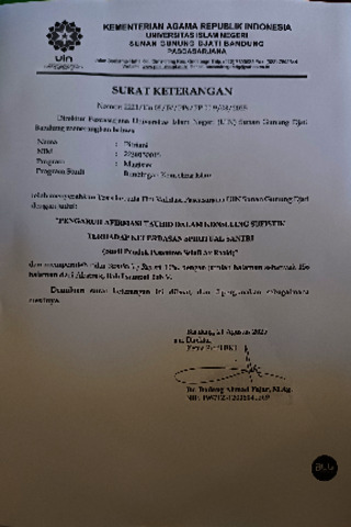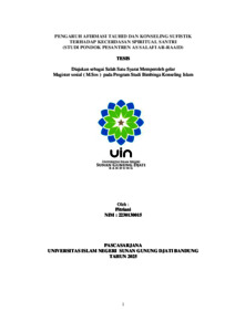 Pitriani, Pitriani (2025) Pengaruh afirmasi tauhid dan konseling sufistik terhadap kecerdasan spiritual santri: Studi Pondok Pesantren As Salafi Ar-Raaid. Masters thesis, UIN Sunan Gunung Djati Bandung.