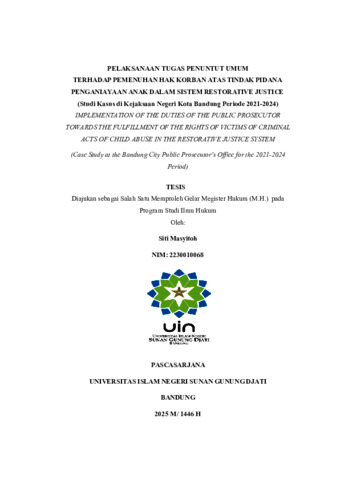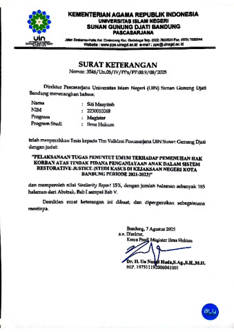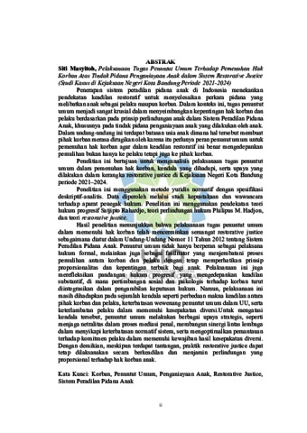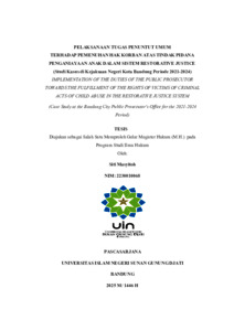 Masyitoh, Siti (2025) Pelaksanaan tugas penuntut umum terhadap pemenuhan hak korban atas tindak pidana penganiayaan anak dalam sistem Restorative Justice: Studi kasus di Kejaksaan Negeri Kota Bandung periode 2021-2024. Masters thesis, UIN Sunan Gunung Djati Bandung.