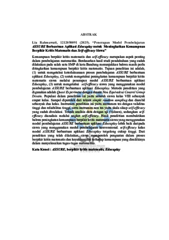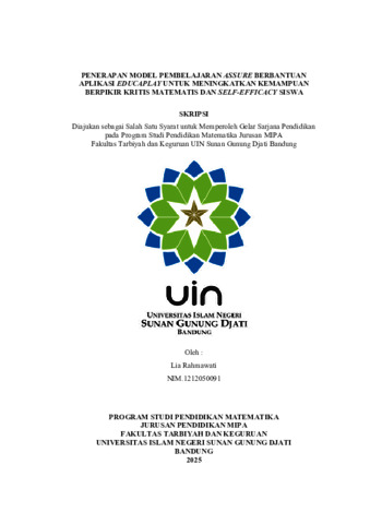 Rahmawati, Lia (2025) Penerapan model pembelajaran ASSURE berbantuan aplikasi Educaplay untuk meningkatkan kemampuan berpikir kritis matematis dan Self-Efficacy siswa. Sarjana thesis, UIN Sunan Gunung Djati Bandung.