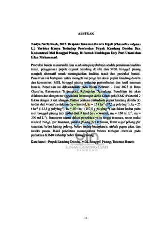 Nurfatimah, Nadya (2025) Respons tanaman buncis tegak (Phaseolus vulgaris L.) varietas kenya terhadap pupuk kandang domba dan konsentrasi MOL bonggol pisang. Sarjana thesis, UIN Sunan Gunung Djati Bandung.