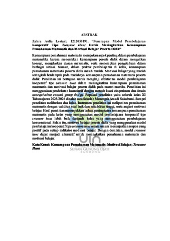 Lestari, Zahra Aulia (2025) Penerapan model pembelajaran kooperatif Tipe Treasure Hunt untuk meningkatkan kemampuan pemahaman matematis dan motivasi belajar peserta didik. Sarjana thesis, UIN Sunan Gunung Djati Bandung.