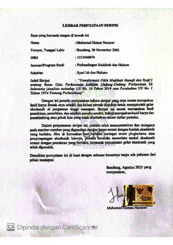Nawawi, Muhamad Hotam (2025) Transformasi fikih madzhab Hanafi dan Syafi’i tentang batas usia perkawinan kedalam undang-undang perkawinan di indonesia: Analisis terhadap uu no. 16 tahun 2019 atas perubahan uu no. 1 tahun 1974 tentang perkawinan. Sarjana thesis, UIN Sunan Gunung Djati Bandung.