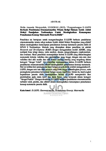 Musyarofah, Melia Amanda (2025) Pengembangan E-LKPD berbasis pendekatan etnomatematika wisata religi makam Syekh Abdul Muhyi Pamijahan Tasikmalaya untuk meningkatkan kemampuan pemahaman konsep matematis peserta didik. Sarjana thesis, UIN Sunan Gunung Djati Bandung.