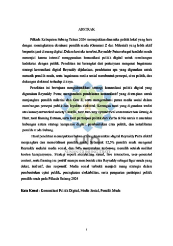 Pilkada Kabupaten Subang tahun 2024 memperlihatkan dinamika baru dalam politik lokal, ditandai dengan meningkatnya dominasi pemilih muda yang terdiri atas Generasi Z dan Milenial yang semakin aktif berpartisipasi di ruang digital. Dalam konteks tersebut, Reynaldy Putra sebagai kandidat muda menonjol melalui pemanfaatan komunikasi politik digital secara intensif untuk membangun kedekatan dengan masyarakat. Penelitian ini berangkat dari pertanyaan mengenai bagaimana strategi komunikasi politik digital Reynaldy Putra dijalankan, pendekatan apa yang digunakan untuk menarik pemilih muda, serta bagaimana media sosial membentuk persepsi, citra politik, dan dukungan elektoral terhadap dirinya. Penelitian ini bertujuan untuk mengidentifikasi strategi komunikasi politik digital yang digunakan oleh Reynaldy Putra, menganalisis pendekatan komunikatif dalam menjangkau pemilih milenial dan Generasi Z, serta mengevaluasi peran media sosial dalam membangun persepsi publik dan loyalitas elektoral. Kerangka teori yang digunakan meliputi konsep networked society dari Castells, teori two-way symmetrical communication dari Grunig dan Hunt, teori framing dari Entman, serta teori partisipasi politik dari Verba dan Nie guna memetakan hubungan antara strategi kampanye digital, pembentukan citra politik, dan keterlibatan pemilih muda di Kabupaten Subang. Hasil penelitian menunjukkan bahwa strategi komunikasi politik digital yang diterapkan Reynaldy Putra efektif dalam menjangkau dan memobilisasi pemilih muda. Sebanyak 82,5% pemilih muda mengenal Reynaldy Putra melalui media sosial, dan 74% responden menyatakan terdorong untuk memilih setelah melihat konten kampanye digitalnya. Strategi komunikasi berupa visual storytelling, interaksi langsung (live interaction), user-generated content, serta framing isu positif terbukti mampu membentuk citra Reynaldy Putra sebagai figur muda yang dekat, inklusif, dan responsif. Media sosial berperan sebagai ruang strategis dalam pembentukan opini publik, peningkatan elektabilitas, serta penguatan partisipasi politik pemilih muda pada Pilkada Kabupaten Subang tahun 2024.