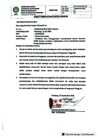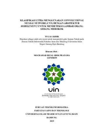 Pratama, Mochamad Rizal Sidik (2025) Klasifikasi citra menggunakan Convolutional Neural Network (CNN) dengan arsitektur MobileNetV2 untuk mendeteksi gambar orang sedang merokok. Sarjana thesis, UIN Sunan Gunung Djati Bandung.