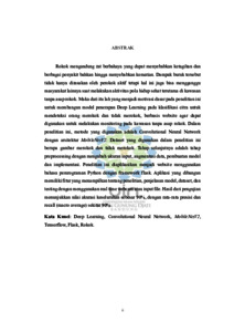 Rokok mengandung zat berbahaya yang dapat menyebabkan ketagihan dan berbagai penyakit bahkan hingga menyebabkan kematian. Dampak buruk tersebut tidak hanya dirasakan oleh perokok aktif tetapi hal ini juga bisa mengganggu masyarakat lainnya saat melakukan aktivitas pola hidup sehat terutama di kawasan tanpa asap rokok. Maka dari itu lah yang menjadi motivasi dasar pada penelitian ini untuk membangun model penerapan Deep Learning pada klasifikasi citra untuk mendeteksi orang merokok dan tidak merokok, berbasis website agar dapat digunakan untuk melakukan monitoring pada kawasan tanpa asap rokok. Dalam penelitian ini, metode yang digunakan adalah Convolutional Neural Network dengan arsitektur MobileNetV2. Dataset yang digunakan dalam penelitian ini berupa gambar merokok dan tidak merokok. Tahap selanjutnya adalah tahap preprocessing dengan mengubah ukuran input, augmentasi data, pembuatan model dan implementasi. Penelitian ini diaplikasikan menjadi website menggunakan bahasa pemrograman Python dengan framework flask. Aplikasi yang dibangun memiliki fitur yang menampilkan tentang penelitian, penjelasan model, dataset, dan testing dengan menggunakan real time webcam atau input file. Hasil dari pengujian menunjukkan nilai akurasi keseluruhan sebesar 90%, dengan rata-rata presisi dan recall (macro average) sekitar 90%. Cigarettes contain harmful substances that can cause addiction and various diseases even to the point of causing death. These bad effects are not only felt by active smokers but this can also disturb other people when carrying out healthy lifestyle activities especially in smoke-free areas. That is what becomes the basic motivation in this research to build a Deep Learning application model on image classification to detect people smoking and not smoking, website-based so that it can be used to monitor smoke-free areas. In this research, the method used is Convolutional Neural Network with MobileNetV2 architecture. The dataset used in this research is in the form of smoking and non-smoking images. The next stage is the preprocessing stage by changing the input size, data augmentation, model creation and implementation. This research is applied into a website using Python programming language with flask framework. The application that is built has features that display about the research, model explanation, dataset, and testing using real time webcam or file input. The results of the testing show an overall accuracy value of 90%, with an average precision and recall (macro average) of around 90%.