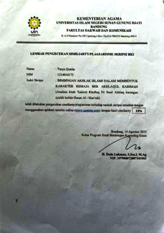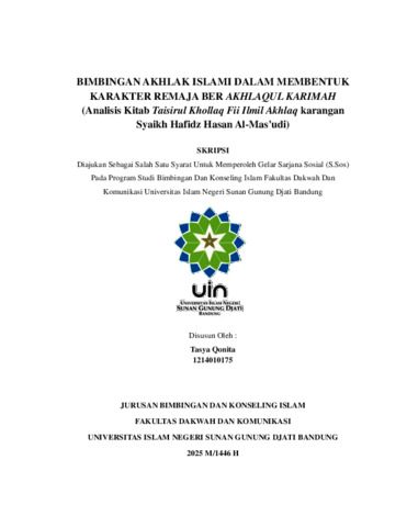 Qonita, Tasya (2025) Bimbingan akhlak Islami dalam membentuk karakter remaja ber Akhlaqul Karimah: Analisis kitab Taisirul Khollaq Fii Ilmil Akhlaq karangan Syaikh Hafidz Hasan Al - Mas'udi. Sarjana thesis, UIN Sunan Gunung Djati Bandung.