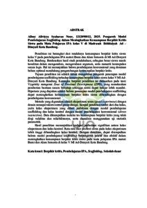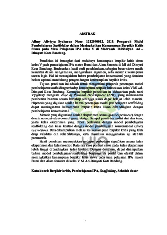 Penelitian ini berangkat dari rendahnya kemampuan berpikir kritis siswa kelas V pada pembelajaran IPA materi Bumi dan Alam Semesta di MI Ad-Dimyati Kota Bandung. Berdasarkan hasil studi pendahuluan, sebagian besar siswa masih kesulitan dalam menganalisis, mengevaluasi argumen, serta menarik kesimpulan secara logis. Hal ini menunjukkan bahwa pembelajaran konvensional yang dominan belum optimal mendukung pengembangan keterampilan berpikir kritis. Tujuan penelitian ini adalah untuk mengetahui pengaruh penerapan model pembelajaran scaffolding terhadap kemampuan berpikir kritis siswa kelas V MI Ad- Dimyati Kota Bandung. Kerangka berpikir penelitian ini didasarkan pada teori Vygotsky mengenai Zone of Proximal Development (ZPD), yang menekankan pemberian bantuan secara bertahap sehingga siswa dapat belajar lebih mandiri. Hipotesis yang diajukan adalah bahwa penerapan model pembelajaran scaffolding dapat meningkatkan kemampuan berpikir kritis siswa dibandingkan dengan pembelajaran konvensional. Metode yang digunakan adalah eksperimen semu (quasi experiment) dengan desain nonequivalent control group design. Sampel penelitian terdiri dari dua kelas, yaitu kelas eksperimen yang diberi perlakuan dengan model pembelajaran scaffolding dan kelas kontrol dengan model pembelajaran konvensional (direct instruction). Data dikumpulkan melalui tes kemampuan berpikir kritis yang telah diuji validitas dan reliabilitasnya, serta dianalisis menggunakan uji statistik parametrik. Hasil penelitian menunjukkan terdapat perbedaan signifikan antara kelas eksperimen dan kelas kontrol. Rata-rata skor posttest siswa pada kelas eksperimen lebih tinggi dibandingkan kelas kontrol. Dengan demikian, dapat disimpulkan bahwa model pembelajaran scaffolding berpengaruh positif dan efektif dalam meningkatkan kemampuan berpikir kritis siswa pada mata pelajaran IPA materi Bumi dan Alam Semesta di kelas V MI Ad-Dimyati Kota Bandung.