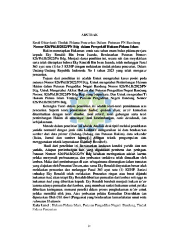 Hakim menetapkan Hukuman vonis satu tahun enam bulan pidana penjara kepada Eky Renaldi Bin Iwan Juanda, Berdasarkan Putusan Nomor: 826/Pid.B/2022/Pn Bdg. Menjadi dasar peniltian ini, secara sah dan meyakinkan serta telah ditetapkan bahwa Eky Renaldi Bin Iwan Juanda, telah melanggar Pasal 363 ayat satu (1) ke 3 KUHP dengan melakukan tindak pidana pencurian, Dalam Undang-Undang Republik Indonesia No 1 tahun 2023 yang telah mengatur pencurian. Tujuan dari penelitian ini adalah Untuk mengetahui kasus posisi pada putusan Nomor 826/Pid.B/2022/PN Bdg. Untuk mengetahui Pertimbangan Hukum Hakim dalam Putusan Pengadilan Negeri Bandung Nomor 826/Pid.B/2022/PN Bdg. Untuk Mengetahui Akibat Hukum dari Putusan Pengadilan Negeri Bandung Nomor: 826/Pid.B/2022/PN Bdg Bagi yang berperkara. Dan Untuk mengetahui Ti Hukum Pidana Islam Tentang Putusan Pengadilan Negeri Bandung Nomor 826/Pid.B/2022/PN Bdg. Kerangka Teori dalam penelitian ini adalah teori-teori pemidanaan atas pencurian. Seperti teori pemidanaan hudud, qishash diyat, ta’zir kemudian ditambahkan dengan teori absolut, teori relatif, teori gabungan serta teori pertimbangan Hakim di antaranya: teori keseimbangan, ratio decidendi, dan kebijaksanaan. Metode dalam penelitian ini adalah Analisis deskriptif melalui pendekatan yuridis normatif dengan jenis data kualitatif menguraikan isi data berdasarkan sumber dari data primer (Undang-Undang dan Putusan Hakim), data sekunder (Buku, Jurnal dan sumber lainnya). Adapun teknik pengumpulan data menggunakan teknik kepustakaan (Library Research). Hasil dari penelitian ini Berdasarkan landasan kondisi yuridis dan non yuridis, Adapun pertimbangan lain yang digunakan pemberat dan peringan. Putusan Nomor: 826/Pid.B/2022/Pn Bdg keadaan meringankan adalah karena pelaku menyesali perbuatannya, dan perbuatan terdakwa telah dimaafkan oleh korban. Maka dari pertimbangan di atas sebagaimana diterangkan dalam tuntutan yang diajukan oleh Penuntut Umum, atas nama Eky Renaldi dinyatakan benar telah melakukan pencurian dan melanggar Pasal 363 ayat satu (1) KUHP. Sanksi terhadap Eky Renaldi telah melakukan Pencurian ringan atau berat dijatuhi hukuman had, akan tetapi Eky Renaldi diberikan pemaafan dari korban sehingga m hukuman had yang diberikan kepada Eky Renaldi berubah menjadi hukum ta’zir karena adanya pemaafan dari korban. yang membuat sanksi hukuman untuk pelaku diberikan keringanan. menurut peneliti dalam proses penghukuman ta’zir untuk pelaku memiliki efek jera. Atas perbuatan pelaku Kemudian Diserahkan dan diputuskan Oleh Ulil Amri (Penguasa) yang berdasarkan kemaslahatan umat serta rahmatan lil alamin