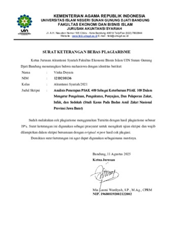Deyara, Vinka (2025) Analisis penerapan PSAK 409 sebagai keterbaruan PSAK 109 dalam mengatur pengakuan, pengukuran, penyajian, dan pengungkapan zakat, infak, sedekah: Studi kasus pada Badan Amil Zakat Nasional Provinsi Jawa Barat. Sarjana thesis, UIN Sunan Gunung Djati Bandung.