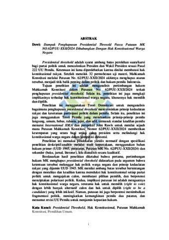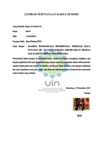 Dewi, Dewi (2025) Dampak penghapusan Presidential Threshold pasca putusan MK NO.62/PUU-XXII/2024 di hubungkan dengan hak konstitusional warga negara. Sarjana thesis, UIN Sunan Gunung Djati Bandung.