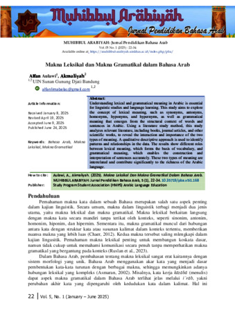Aulawi, Alfan and Akmaliyah, Akmaliyah (2025) Makna Leksikal dan Makna Gramatikal dalam Bahasa Arab. MUHIBBUL ARABIYAH: Jurnal Pendidikan Bahasa Arab, 05 (1). pp. 22-34.