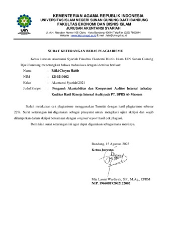 | Uncontrolled Keywords: | Akuntanbilitas; Kompetensi; Kualitas Hasil Kinerja Internal Audit; PT BPRS ALMASOEM |