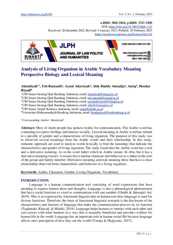 Akmaliyah, Akmaliyah and Ratnasih, Teti and Adawiyah, Ayuni and Atmadja, Aldy Rialdy and Riyadi, Hendar (2023) Analysis of Living Organism in Arabic Vocabulary Meaning Perspective Biology and Lexical Meaning. Journal of Law, Politic and Humanities, 3 (2). pp. 263-273.