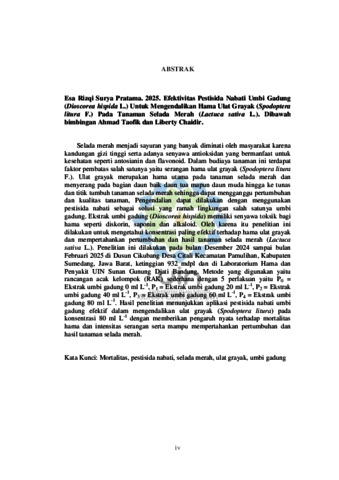 INDONESIA: Selada merah menjadi sayuran yang banyak diminati oleh masyarakat karena kandungan gizi tinggi serta adanya senyawa antioksidan yang bermanfaat untuk kesehatan seperti antosianin dan flavonoid. Dalam budiaya tanaman ini terdapat faktor pembatas salah satunya yaitu serangan hama ulat grayak (Spodoptera litura F.). Ulat grayak merupakan hama utama pada tanaman selada merah dan menyerang pada bagian daun baik daun tua mapun daun muda hingga ke tunas dan titik tumbuh tanaman selada merah sehingga dapat mengganggu pertumbuhan dan kualitas tanaman, Pengendalian dapat dilakukan dengan menggunakan pestisida nabati sebagai solusi yang ramah lingkungan salah satunya umbi gadung. Ekstrak umbi gadung (Dioscorea hispida) memiliki senyawa toksik bagi hama seperti diskorin, saponin dan alkaloid. Oleh karena itu penelitian ini dilakukan untuk mengetahui konsentrasi paling efektif terhadap hama ulat grayak dan mempertahankan pertumbuhan dan hasil tanaman selada merah (Lactuca sativa L.). Penelitian ini dilakukan pada bulan Desember 2024 sampai bulan Februari 2025 di Dusun Cikubang Desa Citali Kecamatan Pamulihan, Kabupaten Sumedang, Jawa Barat, ketinggian 932 mdpl dan di Laboratorium Hama dan Penyakit UIN Sunan Gunung Djati Bandung. Metode yang digunakan yaitu rancangan acak kelompok (RAK) sederhana dengan 5 perlakuan yaitu P0 = Ekstrak umbi gadung 0 ml L-1, P1 = Ekstrak umbi gadung 20 ml L-1, P2 = Ekstrak umbi gadung 40 ml L-1, P3 = Ekstrak umbi gadung 60 ml L-1, P4 = Ekstrak umbi gadung 80 ml L-1. Hasil penelitian menunjukkan aplikasi pestisida nabati umbi gadung efektif dalam mengendalikan ulat grayak (Spodoptera litura) pada konsentrasi 80 ml L-1 dengan memberikan pengaruh nyata terhadap mortalitas hama dan intensitas serangan serta mampu mempertahankan pertumbuhan dan hasil tanaman selada merah. ENGLISH: Red lettuce is a vegetable that is highly favored by the public due to its high nutritional content and the presence of antioxidant compounds beneficial to health, such as anthocyanins and flavonoids. However, in its cultivation, one limiting factor is the infestation of armyworms (Spodoptera litura F.), which are the main pests of red lettuce. These pests attack the leaves—both mature and young—as well as the shoots and growing points, thereby disrupting plant growth and reducing crop quality. Pest control can be carried out using botanical pesticides as an environmentally friendly alternative, one of which is the yam tuber (Dioscorea hispida). Yam tuber extract contains toxic compounds such as dioscorine, saponins, and alkaloids, which are harmful to pests. Therefore, this study was conducted to determine the most effective concentration of yam tuber extract for controlling armyworms and maintaining the growth and yield of red lettuce (Lactuca sativa L.). The research was carried out from December 2024 to February 2025, the research was conducted in Cikubang Hamlet, Citali Village, Pamulihan Subdistrict, Sumedang Regency, West Java, at an altitude of 932 meters above sea level, and at the Laboratory of Pests and Diseases, State Islamic University (UIN) Sunan Gunung Djati Bandung.. The method used was a simple randomized block design (RBD) with five treatments: P0 = Yam tuber extract 0 ml L-1 (control), P1 = Yam tuber extract 20 ml L-1, P2 = Yam tuber extract 40 ml L-1, P3 = Yam tuber extract 60 ml L-1, P4 = Yam tuber extract 80 ml L-1. The results showed that applying yam tuber-based botanical pesticides was effective in controlling Spodoptera litura at a concentration of 80 ml L-1. This concentration significantly increased pest mortality and reduced the intensity of infestation, while also supporting the growth and yield of red lettuce.