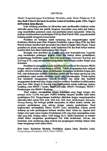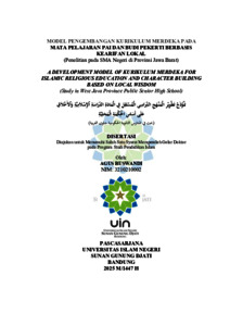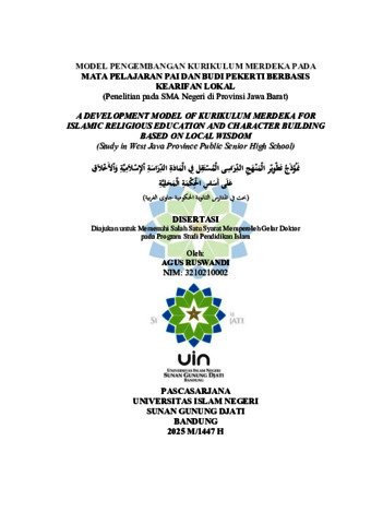 Indonesia : Latar belakang penelitian ini didasarkan pada problematika dualisme antara nilai-nilai ajaran Islam dan praktik beragama masyarakat yang sudah jadi budaya, yang menimbulkan polarisasi sosial, dan perdebatan dalam masyarakat. Selain itu, perlunya kontekstualisasi pembelajaran PAI dan Budi Pekerti SMA yang akomodatif terhadap praktik beragama di masyarakat. Penelitian ini bertujuan untuk merancang dan mengembangkan model Kurikulum Merdeka pada Mata Pelajaran Pendidikan Agama Islam (PAI) dan Budi Pekerti berbasis kearifan lokal masyarakat Jawa Barat di tingkat SMA Negeri. Tujuan penelitian ini adalah menghasilkan model kurikulum PAI dan Budi Pekert berbasis kearifan lokal Jawa Barat untuk jenjang SMA Negeri. Kerangka teori penelitian ini berpijak pada teori konstruktivisme Vygotsky yang menekankan pentingnya konteks sosial dan budaya dalam pembelajaran, pengambangan Kurikulum model Taba serta pendekatan Contextual Teaching And Learning (CTL) yang memposisikan pengalaman lokal sebagai sumber belajar yang bermakna. Penelitian ini menggunakan jenis penelitian Research and Development (R&D) dengan melalui model pengembangan ADDIE. Teknik pengumpulan data meliputi angket, observasi terhadap proses pembelajaran, wawancara mendalam dengan guru PAI, studi dokumentasi terhadap kurikulum, modul ajar, dan bahan ajar dan uji coba pembelajaran untuk menilai efektivitas model yang dikembangkan. Teknik analisis data kuantitatif menggunakan statistik deskriptif dan untuk data kualitatif menggunakan kondensasi data, display data dan verifikasi. Penelitian ini dilaksanakan pada lima SMA Negeri di Provinsi Jawa Barat melalui teknik multistage random sampling, yaitu SMAN 1 Surade, SMAN 24 Garut, SMAN 2 Kuningan, SMAN 1 Pusakanagara, dan SMAN 4 Bandung. Hasil analisis menunjukkan adanya kebutuhan yang tinggi dengan skor persepsi siswa 73,16% dan guru 74,96% terhadap integrasi kearifan lokal dalam pembelajaran PAI. Pengembangan kurikulum dilakukan dengan mengintegrasikan nilai-nilai lokal seperti Silih Asah, Silih Asih, Silih Asuh, Sabilulungan, Sauyunan, Gotong Royong, dan berbagai praktik masyarakat, ke dalam konten, metode, dan asesmen pembelajaran yang relevan dengan capaian pembelajaran. Hasil implementasi menunjukkan bahwa 88,48% siswa memberikan respons positif terhadap uji coba pembelajaran berbasis kearifan lokal. Selain itu, capaian hasil belajar siswa pada enam Capaian Pembelajaran (CP) yang diuji menunjukkan rerata nilai yang baik, berkisar antara 75,08 hingga 84,21. Model kurikulum ini terbukti efektif dalam menjadikan pembelajaran PAI lebih kontekstual, relevan, dan bermakna, serta mendorong sikap moderat dan penghargaan terhadap budaya lokal tanpa mengurangi esensi ajaran Islam. Kata kunci: Kurikulum Merdeka, Pendidikan Agama Islam, Kearifan Lokal, Pengembangan Kurikulum, R&D, Model ADDIE. vi English: The background of this study is based on the issue of dualism between the values of Islamic teachings and the religious practices that have become part of local culture, which has led to social polarization and debates within society. In addition, there is a need for contextualizing Islamic Education and Character Education (PAI and Budi Pekerti) learning in senior high schools so that it accommodates religious practices in the community. This study aims to design and develop an Independent Curriculum model for the subject of Islamic Religious Education and Character Education based on the local wisdom of West Java communities at the public senior high school level. The objective of this study is to produce a curriculum model of Islamic Religious Education and Character Education that integrates local wisdom values of West Java for public senior high schools. The theoretical framework of this study is grounded in Vygotsky’s constructivist theory, which emphasizes the importance of social and cultural contexts in learning. It also adopts Taba’s curriculum development model and the Contextual Teaching and Learning (CTL) approach, which positions local experience as a meaningful source of learning. This study employed the Research and Development (R&D) method using the ADDIE development model. Data were collected through questionnaires, classroom observations, in-depth interviews with Islamic Education teachers, documentation studies of the curriculum, teaching modules, and learning materials, as well as learning trials to evaluate the effectiveness of the developed model. Quantitative data were analyzed using descriptive statistics, while qualitative data were analyzed through data condensation, data display, and verification. The study was conducted in five public senior high schools in West Java Province using multistage random sampling: SMAN 1 Surade, SMAN 24 Garut, SMAN 2 Kuningan, SMAN 1 Pusakanagara, and SMAN 4 Bandung. The analysis results indicate a high level of need for integrating local wisdom into Islamic Education learning, with students’ perception scores reaching 73.16% and teachers’ perception scores reaching 74.96%. The curriculum development integrated local values such as Silih Asah, Silih Asih, Silih Asuh, Sabilulungan, Sauyunan, and Gotong Royong into the content, methods, and assessments relevant to the learning outcomes. The implementation results show that 88.48% of students responded positively to the trial learning based on local wisdom. Furthermore, students’ learning achievement across six assessed Learning Outcomes (CP) demonstrated good average scores ranging from 75.08 to 84.21. This curriculum model has proven effective in making Islamic Religious Education more contextual, relevant, and meaningful. It also promotes moderate attitudes and appreciation for local culture without diminishing the essence of Islamic teachings. Keywords: Independent Curriculum, Islamic Religious Education, Local Wisdom, Curriculum Development, Research and Development, ADDIE Model. . Arabic: المُلخَّ ص نَُم وُذَُ م جُ تَُُُطُ وي رُ اُُل