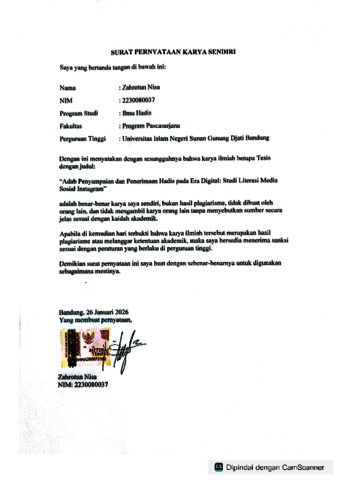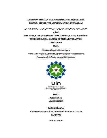 Nisa, Zahrotun (2025) Adab penyampaian dan penerimaan hadis pada era digital: Studi literasi media sosial Instagram. Masters thesis, UIN Sunan Gunung Djati Bandung.