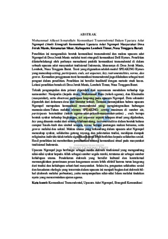 Penelitian ini menganalisis bentuk komunikasi transendental dan makna upacara adat Ngempel di Desa Jeruk Manis melalui teori etnografi komunikasi Dell Hymes. Penelitian dilatarbelakangi oleh perlunya memahami praktik komunikasi transendental di dalam sebuah upacara adat masyarakat tradisional Indonesia, khususnya di Desa Jeruk Manis, Lombok, Nusa Tenggara Barat. Teori yang digunakan adalah model SPEAKING Hymes yang mencakup setting, participants, ends, act sequence, key, instrumentalities, norms, dan genres. Kemudian penggunaan teori komunikasi transendental juga dilakukan sebagai teori penguat dalam penelitian. Penelitian ini bersifat kualitatif dengan metode studi kasus. Lokasi penelitian berada di Desa Jeruk Manis, Lombok Timur, Nusa Tenggara Barat. Teknik pengumpulan data primer diperoleh dari wawancara mendalam terhadap tiga narasumber: Nasipudin (kepala desa), Muhammad Rum (tokoh agama), dan Khairudin (masyarakat), serta observasi partisipan langsung pada upacara Ngempel. Data sekunder diperoleh dari dokumen desa dan literatur terkait. Temuan menunjukkan bahwa upacara Ngempel merupakan komunikasi transendental yang mengintegrasikan hubungan manusia-alam-Tuhan melalui elemen SPEAKING: setting musiman di sumber air, participants berstruktur (tokoh agama-adat-pekasih-masyarakat-yatim) , ends berupa bentuk syukur terhadap lingkungan, act sequence seperti tahapan ritual yang dijalankan, key yang dinamis mulai dari senang-khidmat-riang, instrumentalities dalam bentuk bahasa campur Sasak-Arab dan simbol sesajen, norms berupa pantangan makan bersama, serta genres melalui doa sakral. Makna utama yang terkandung dalam upacara adat Ngempel mencakup syukur, solidaritas gotong royong, dan pelestarian tradisi, meskipun dampak religiusitas individu tidak terlalu signifikan karena lebih berfokus kepada solidaritas sosial. Hasil penelitian ini memberikan pemahaman tentang komunikasi ritual pada masyarakat tradisional Indonesia. Upacara Ngempel juga berfungsi sebagai media dakwah tradisional yang mengandung nilai-nilai syukur kepada Allah sebagai sumber segala rezeki, terutama air sebagai sumber kehidupan utama. Pendekatan dakwah yang bersifat kultural dan kontekstual memungkinkan penerimaan pesan keagamaan secara lebih efektif karena turun langsung dari tradisi dan kehidupan sehari-hari masyarakat. Selain itu, penguatan solidaritas sosial dan kesadaran ekologis yang tercermin dalam upacara ini menjadi bagian dari dakwah bil-hal (dakwah melalui perbuatan), yaitu menyampaikan nilai-nilai Islam melalui tindakan nyata yang mencerminkan ajaran agama.