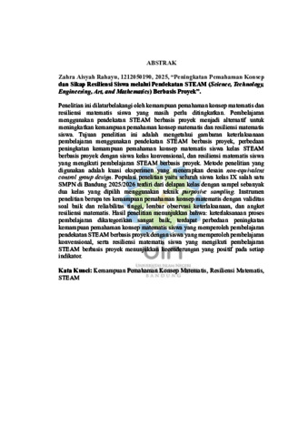 Rahayu, Zahra Aisyah (2025) Peningkatan pemahaman konsep dan sikap resiliensi siswa melalui pendekatan STEAM (Science, Technology, Engineering, Art, and Mathematics) berbasis proyek. Sarjana thesis, UIN Sunan Gunung Djati Bandung.