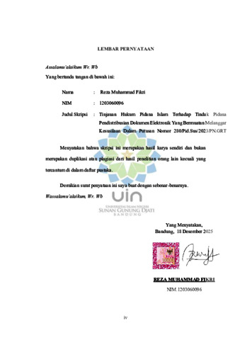 Fikri, Reza Muhammad (2025) Tinjauan hukum pidana Islam terhadap tindak pidana pendistribusian dokumen elektronik yang bermuatan melanggar kesusilaan dalam putusan nomor 280/Pid.Sus/2023/PN.GRT. Sarjana thesis, UIN Sunan Gunung Djati.