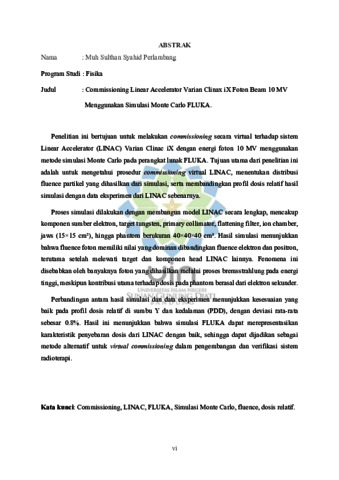 Penelitian ini bertujuan untuk melakukan commissioning secara virtual terhadap sistem Linear Accelerator (LINAC) Varian Clinac iX dengan energi foton 10 MV menggunakan metode simulasi Monte Carlo pada perangkat lunak FLUKA. Tujuan utama dari penelitian ini adalah untuk mengetahui prosedur commissioning virtual LINAC, menentukan distribusi fluence partikel yang dihasilkan dari simulasi, serta membandingkan profil dosis relatif hasil simulasi dengan data eksperimen dari LINAC sebenarnya. Proses simulasi dilakukan dengan membangun model LINAC secara lengkap, mencakup komponen sumber elektron, target tungsten, primary collimator, flattening filter, ion chamber, jaws (15×15 cm²), hingga phantom berukuran 40×40×40 cm³. Hasil simulasi menunjukkan bahwa fluence foton memiliki nilai yang dominan dibandingkan fluence elektron dan positron, terutama setelah melewati target dan komponen head LINAC lainnya. Fenomena ini disebabkan oleh banyaknya foton yang dihasilkan melalui proses bremsstrahlung pada energi tinggi, meskipun kontribusi utama terhadap dosis pada phantom berasal dari elektron sekunder. Perbandingan antara hasil simulasi dan data eksperimen menunjukkan kesesuaian yang baik pada profil dosis relatif di sumbu Y dan kedalaman (PDD), dengan deviasi rata-rata sebesar 0.8%. Hasil ini menunjukkan bahwa simulasi FLUKA dapat merepresentasikan karakteristik penyebaran dosis dari LINAC dengan baik, sehingga dapat dijadikan sebagai metode alternatif untuk virtual commissioning dalam pengembangan dan verifikasi sistem radioterapi. This study aims to perform a virtual commissioning of the Varian Clinac iX Linear Accelerator (LINAC) system with a photon beam energy of 10 MV using the Monte Carlo simulation method through the FLUKA software. The main objectives are to understand the procedure for virtual LINAC commissioning, determine the particle fluence distribution obtained from the simulation, and compare the relative dose profiles from the virtual simulation with experimental data from the actual LINAC. The simulation was conducted by constructing a complete LINAC model, including the electron source, tungsten target, primary collimator, flattening filter, ion chamber, jaws (15×15 cm²), and a phantom measuring 40×40×40 cm³. The simulation results indicate that photon fluence dominates over electron and positron fluence, especially after passing through the target and other LINAC head components. This is due to the large number of photons generated through bremsstrahlung interactions at high energies, although the primary dose contribution in the phantom is mainly from secondary electrons. A comparison between the simulation results and experimental data shows good agreement in the relative dose profile along the Y-axis and depth (PDD), with an average deviation of 0.8%. These findings demonstrate that FLUKA simulations can reliably represent the dose distribution characteristics of a LINAC, making it a viable alternative method for virtual commissioning in radiotherapy system development and verification.