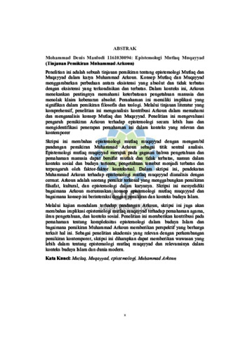 Penelitian ini adalah sebuah tinjauan pemikiran tentang epistemologi Mutlaq dan Muqayyad dalam karya Muhammad Arkoun. Konsep Mutlaq dan Muqayyad menggambarkan perbedaan antara eksistensi yang absolut dan tidak terbatas dengan eksistensi yang terkondisikan dan terbatas. Dalam konteks ini, Arkoun menekankan pentingnya memahami keterbatasan pengetahuan manusia dan menolak klaim kebenaran absolut. Pemahaman ini memiliki implikasi yang signifikan dalam pemikiran filosofis dan teologi. Melalui tinjauan literatur yang komprehensif, penelitian ini menganalisis kontribusi Arkoun dalam memahami dan menganalisis konsep Mutlaq dan Muqayyad. Penelitian ini mengevaluasi pengaruh pemikiran Arkoun terhadap epistemologi secara lebih luas dan mengidentifikasi penerapan pemahaman ini dalam konteks yang relevan dan kontemporer Skripsi ini membahas epistemologi mutlaq muqayyad dengan mengambil pandangan pemikiran Muhammad Arkoun sebagai titik sentral analisis. Epistemologi mutlaq muqayyad merujuk pada gagasan bahwa pengetahuan dan pemahaman manusia dapat bersifat mutlak dan tidak terbatas, namun dalam konteks sosial dan budaya tertentu, pengetahuan tersebut menjadi terbatas dan terpengaruh oleh faktor-faktor kontekstual. Dalam skripsi ini, pendekatan Muhammad Arkoun terhadap epistemologi mutlaq muqayyad dianalisis dengan cermat. Arkoun adalah seorang pemikir terkenal yang menggabungkan pemikiran filsafat, kultural, dan epistemologi dalam karyanya. Skripsi ini menyelidiki bagaimana Arkoun merumuskan konsep epistemologi mutlaq muqayyad dan bagaimana konsep ini berinteraksi dengan pemikiran dan konteks budaya Islam. Melalui kajian mendalam terhadap pandangan Arkoun, skripsi ini juga akan membahas implikasi epistemologi mutlaq muqayyad terhadap pemahaman agama, ilmu pengetahuan, dan konteks sosial. Penelitian ini memberikan kontribusi pada pemahaman tentang kompleksitas epistemologi dalam budaya Islam dan bagaimana pemikiran Muhammad Arkoun memberikan perspektif yang berharga terkait hal ini. Sebagai penelitian akademis yang relevan dengan perkembangan pemikiran kontemporer, skripsi ini diharapkan dapat memberikan wawasan yang lebih dalam tentang epistemologi mutlaq muqayyad dan relevansinya dalam konteks budaya Islam dan dunia modern.