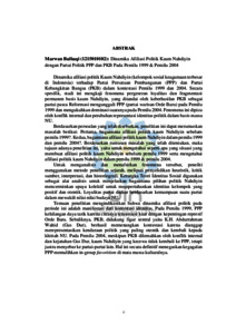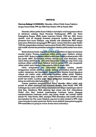 Dinamika afiliasi politik Kaum Nahdiyin (kelompok sosial keagamaan terbesar di Indonesia) terhadap Partai Persatuan Pembangunan (PPP) dan Partai Kebangkitan Bangsa (PKB) dalam kontestasi Pemilu 1999 dan 2004. Secara spesifik, studi ini mengkaji fenomena pergeseran loyalitas dan fragmentasi permanen basis kaum Nahdiyin, yang ditandai oleh keberhasilan PKB sebagai partai pasca Reformasi mengungguli PPP (partai warisan Orde Baru) pada Pemilu 1999 dan mengukuhkan dominasi suaranya pada Pemilu 2004. Fenomena ini dipicu oleh konflik internal dan perubahan representasi identitas politik dalam basis massa NU. Berdasarkan persoalan yang telah disebutkan, penelitian ini dapat merumuskan masalah berikut: Pertama, bagaimana afiliasi politik kaum Nahdiyin sebelum pemilu 1999?. Kedua, bagaimana afiliasi politik kaum Nahdiyin dalam pemilu 1999 dan pemilu 2004?. Berdasarkan rumusan masalah yang telah ditentukan, maka tujuan adanya penelitian ini, yaitu untuk mengetahui seperti apa yang situasi yang membuat afiliasi politik kaum Nahdiyin sebelum pemilu 1999 serta mengetahui afiliasi politik kaum Nahdiyin dalam pemilu 1999 & pemilu 2004. Untuk menganalisis dan menafsirkan fenomena tersebut, peneliti menggunakan metode penelitian sejarah, meliputi penyelidikan heuristik, kritik sumber, interpretasi, dan historiografi. Kerangka Teori Identitas Sosial digunakan sebagai alat analisis untuk menjelaskan bagaimana pilihan politik Nahdiyin mencerminkan upaya kolektif untuk mempertahankan identitas kelompok yang positif dan otentik. Loyalitas partai diukur berdasarkan kemampuan suatu partai dalam mewakili nilai-nilai budaya NU. Temuan penelitian mengindikasikan bahwa dinamika afiliasi politik pada periode ini adalah manifestasi dari kontestasi identitas. Pada Pemilu 1999, PPP kehilangan daya tarik karena citranya terasosiasi kuat dengan kepentingan represif Orde Baru. Sebaliknya, PKB, didukung figur sentral yaitu K.H. Abdurrahman Wahid (Gus Dur), berhasil memenangkan kontestasi karena dianggap merepresentasikan kendaraan politik yang paling otentik dan kembali kepada khittah NU. Pada Pemilu 2004, meskipun PKB dilemahkan oleh konflik internal dan kejatuhan Gus Dur, kaum Nahdiyin yang kecewa tidak kembali ke PPP, tetapi justru menyebar ke partai-partai lain. Hal ini secara definitif menegaskan kegagalan PPP memulihkan in-group favoritism di mata massa kulturalnya.