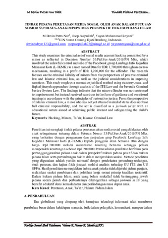 Putra Nur, M Devin and Saepullah, Usep and Royani, Yayan Muhammad (2025) Tindak pidana peretasan media sosial oleh anak dalam putusan nomor 53/pid.sus-anak/2019/pn mks perspektif hukum pidana islam. Kartika: Jurnal Studi Keislaman, 5 (3). pp. 2425-2443. ISSN 2810-0573