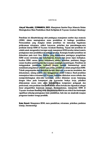 Penelitian ini dilatarbelakangi oleh pentingnya manajemen sumber daya manusia (SDM) dalam meningkatkan mutu pendidikan di lembaga pendidikan. Permasalahan yang diangkat dalam penelitian ini mencakup bagaimana pelaksanaan rekrutmen, seleksi karyawan, pelatihan dan penembangan,serta penilaian kinerja SDM di Yayasan Assalaam Bandung. Tujuan dari penelitian ini adalah untuk menganalisis keempat aspek manajemen SDM tersebut dalam konteks peningkatan mutu pendidikan di lembaga tersebut. Kerangka berpikir penelitian ini didasarkan pada teori Gary Dessler yang menekankan pentingnya pengelolaan SDM secara terstruktur dan berkelanjutan, dimulai dari proses input (kebijakan. kualitas SDM. sarana, proses (rekrutmen, seleksi, pelatihan, penilaian), hingga output (kualitas pembelajaran dan kepuasan pemangku kepentingan). Penelitian ini menggunakan pendekatan kualitatif dengan metode fenomenologi untuk mendalami pengalaman subjektif para pelaku pendidikan, dalam pengelolaan SDM. Teknik pengumpulan data dilakukan melalui observasi, wawancara mendalam, dan dokumentasi, sedang analisis data menggunakan model Colaizzi. Hasil penelitian menunjukan bahwa rekrutmen di Yayasan Assalaam dilakukan secara terbuka dan mempertimbangkan nilai-nilai keislaman, seleksi dilakukan secara berjenjang dengan fokus pada kompetensi dan kesesuaian budaya kerja, pelatihan dilaksanakan secara rutin untuk meningkatkan kompetensi pedagogik dan profesional, serta penilaian kinerja dilakukan secara berkala dan digunakan sebagai dasar pengambilan keputusan strategis. Kesimpulannya, manajemen SDM di Yayasan Assalaam Bandung telah diimplementasikan secara efektif dan berdampak signifikan terhadap peningkatan mutu pendidikan, baik dan sısı akademik maupun penguatan karakter tenaga pendidik.