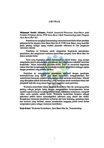 Penelitian ini bertujuan untuk mengetahui bagaimana pemahaman, pemaknaan, dan pengalaman wartawan kontributor program Jawa Barat Hari Ini dalam meliput berita. Teori yang digunakan adalah fenomenologi Alfred Schutz yang mampu menjelaskan proses pemahaman, pemaknaan, dan pengalaman subjektif wartawan kontributor dalam melakukan peliputan berita. Teori ini menyoroti bagaimana makna lahir dari pengalaman dan kesadaran wartawan kontributor sehingga sejalan dengan penelitian yang penulis lakukan Penelitian ini menggunakan pendekatan kualitatif dengan paradigma konstruktivisme yang dipilih agar dapat memahami, menggambarkan, dan menafsirkan fenomena subjektif yang dialami oleh wartawan kontributor. Metode yang diterapkan adalah fenomenologi, yang bertujuan untuk memahami dunia dari perspektif individu yang secara langsung mengalami suatu peristiwa. Wartawan kontributor dalam program Jawa Barat Hari Ini memegang peran penting sebagai peliput berita dengan mengandalkan kemampuannya secara mandiri seperti mencari isu, pengambilan visual, melakukan wawancara, mengedit video, serta menulis naskah berita. Wartawan kontributor berperan sebagai pelayanan publik dalam menyampaikan informasi yang akurat dan aktual. Pengalaman wartawan kontributor terbentuk dari latar belakang, perjalanan karir dan motivasi yang berbeda, namun menekankan tanggung jawab sosial dalam menjalankan peran sebagai wartawan kontributor.