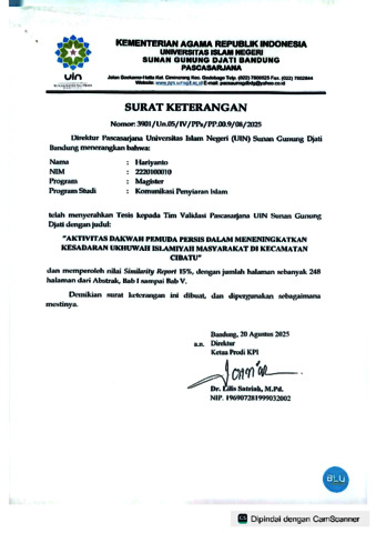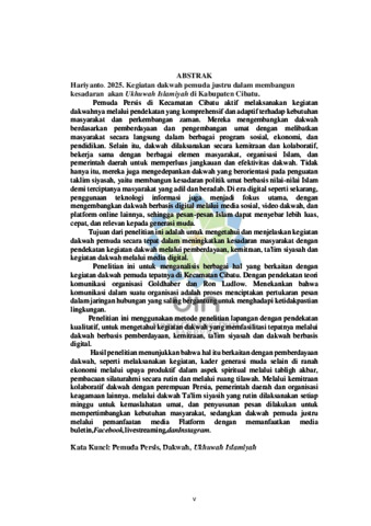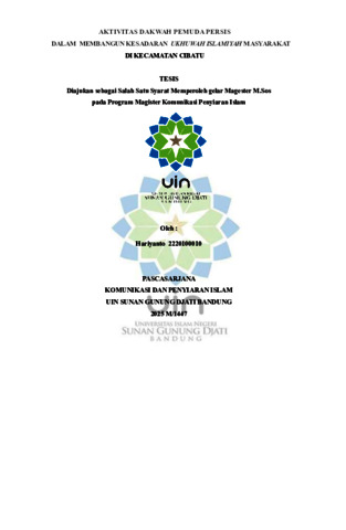 Hariyanto. 2025. Kegiatan dakwah pemuda justru dalam membangun kesadaran akan Ukhuwah Islamiyah di Kabupaten Cibatu.Pemuda Persis di Kecamatan Cibatu aktif melaksanakan kegiatandakwahnya melalui pendekatan yang komprehensif dan adaptif terhadap kebutuhan masyarakat dan perkembangan zaman. Mereka mengembangkan dakwah berdasarkan pemberdayaan dan pengembangan umat dengan melibatkan masyarakat secara langsung dalam berbagai program sosial, ekonomi, dan pendidikan. Selain itu, dakwah dilaksanakan secara kemitraan dan kolaboratif, bekerja sama dengan berbagai elemen masyarakat, organisasi Islam, dan pemerintah daerah untuk memperluas jangkauan dan efektivitas dakwah. Tidak hanya itu, mereka juga mengedepankan dakwah yang berorientasi pada penguatan taklim siyasah, yaitu membangun kesadaran politik umat berbasis nilai-nilai Islam demi terciptanya masyarakat yang adil dan beradab. Di era digital seperti sekarang, penggunaan teknologi informasi juga menjadi fokus utama, dengan mengembangkan dakwah berbasis digital melalui media sosial, video dakwah, dan platform online lainnya, sehingga pesan-pesan Islam dapat menyebar lebih luas,cepat, dan relevan kepada generasi muda. Tujuan dari penelitian ini adalah untuk mengetahui dan menjelaskan kegiatan dakwah pemuda secara tepat dalam meningkatkan kesadaran masyarakat dengan pendekatan kegiatan dakwah melalui pemberdayaan, kemitraan, ta'lim siyasah dan kegiatan dakwah melalui media digital. Penelitian ini untuk menganalisis berbagai hal yang berkaitan dengan kegiatan dakwah pemuda tepatnya di Kecamatan Cibatu. Dengan pendekatan teori komunikasi organisasi Goldhaber dan Ron Ludlow. Menekankan bahwa komunikasi dalam suatu organisasi adalah proses menciptakan pertukaran pesan dalam jaringan hubungan yang saling bergantung untuk menghadapi ketidakpastian lingkungan. Penelitian ini menggunakan metode penelitian lapangan dengan pendekatan kualitatif, untuk mengetahui kegiatan dakwah yang memfasilitasi tepatnya melalui dakwah berbasis pemberdayaan, kemitraan, ta'lim siyasah dan dakwah berbasis digital. Hasil penelitian menunjukkan bahwa hal itu berkaitan dengan pemberdayaan dakwah, seperti melaksanakan kegiatan, kader generasi muda selain di ranah ekonomi melalui upaya produktif dalam aspek spiritual melalui tabligh akbar, pembacaan silaturahmi secara rutin dan melalui ruang tilawah. Melalui kemitraan kolaboratif dakwah dengan perempuan Persia, pemerintah daerah dan organisasi keagamaan lainnya. melalui dakwah Ta'lim siyasih yang rutin dilaksanakan setiap minggu untuk kemaslahatan umat, dan penyusunan pesan dilakukan untuk mempertimbangkan kebutuhan masyarakat, sedangkan dakwah pemuda justru melalui pemanfaatan media Flatform dengan memanfaatkan media buletin, Facebook, livestreaming, dan Instagram.