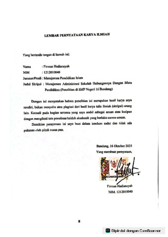 Hadiansyah, Firman and UNSPECIFIED and UNSPECIFIED (2025) Manajemen administrasi sekolah hubungannya dengan mutu pendidikan: Penelitian di SMP Negeri 16 Bandung. Sarjana thesis, UIN Sunan Gunung Djati Bandung.
