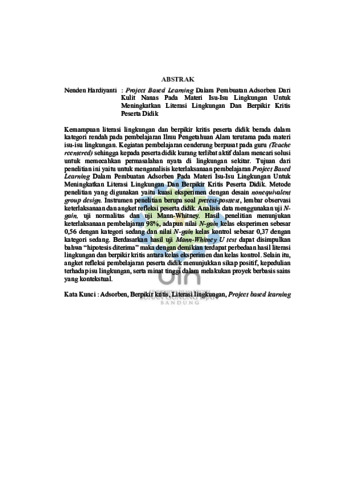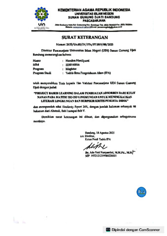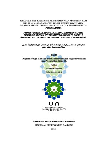 Hardiyanti, Nenden (2025) Project based learning dalam pembuatan adsorben dari kulit nanas pada materi isu-isu lingkungan untuk meningkatkan literasi lingkungan dan berpikir kritis peserta didik. Masters thesis, UIN Sunan Gunung Djati Bandung.