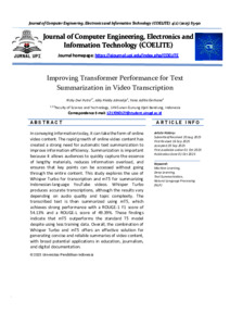 Putra, Rizky Dwi and Atmadja, Aldy Rialdy and Gerhana, Yana Aditia (2025) Improving transformer performance for text summarization in video transcription. Journal of Computer Engineering, Electronics and Information Technology (COELITE, 4 (2). pp. 1-8. ISSN 2829-4149