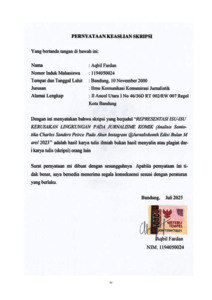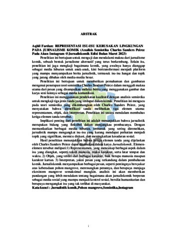 Penelitian ini bertujuan untuk menguji dan mendalami makna dari jurnalisme komik, sebuah bentuk jurnalisme alternatif yang terus berkembang. Selain itu, penelitian ini juga mengkaji bagaimana komik, yang awalnya hanya dianggap sebagai media hiburan untuk anak-anak, kini bertransformasi menjadi platform yang mampu menyampaikan berita jurnalistik, termasuk isu-isu hangat dan topik yang jarang dibahas oleh media-media besar. Penelitian ini bertujuan untuk memberikan pemahaman dan gambaran mengenai penerapan teori semiotika Charles Sanders Peirce dalam menggali makna utama dari pesan yang disampaikan melalui berita yang menggunakan gambar dan karya seni lainnya sebagai media komunikasi. Penelitian ini menggunakan pendekatan kualitatif dengan analisis semiotika untuk mengkaji tiga jenis tanda yang terdapat dalam komik. Penelitian ini mengacu pada teori semiotika yang dikembangkan oleh Charles Sanders Peirce, yang menyatakan bahwa identifikasi tanda melibatkan tiga elemen utama: representamen, objek, dan interpretan. Penelitian ini secara mendalam membahas ketiga elemen tanda tersebut. Implikasi penting dari penelitian ini adalah menunjukkan bahwa jurnalistik merupakan bidang yang fleksibel dalam menjangkau pembacanya. Dengan memanfaatkan berbagai media hiburan, termasuk yang sering diremehkan, jurnalistik mampu mengangkat isu-isu yang kurang mendapat perhatian menjadi topik yang signifikan, memicu diskusi, dan meningkatkan kesadaran sosial. Hasil penelitian menunjukkan bahwa ketiga elemen tanda yang dijelaskan oleh Charles Sanders Peirce dapat ditemukan dalam karya Jurnaliskomik. Elemen- elemen tersebut meliputi:1) Representamen, yang mencakup berbagai aspek dalam isu yang diangkat, seperti tokoh manusia, reaksi karakter, serta latar tempat dan waktu. 2) Objek, yang terdiri dari berbagai karakter, baik berupa manusia maupun karakter kartun. 3) Interpretan, yakni pesan yang terkandung dalam pembahasan komik. Jurnaliskomik menyampaikan berbagai pesan, seperti pentingnya bersyukur atas keberadaan pohon mangrove, merenungkan perannya, dan berupaya menjaga ekosistem mangrove semaksimal mungkin. analisis ini akan memberikan pandangan yang lebih mendalam tentang bagaimana akun jurnaliskomik berperan sebagai media sosial yang mampu menjadi kontrol sosial, bersifat humanitarian dan berupaya mengangkat isu yang tak terlihat di masyarakat. ENGLISH: This study aims to analyze and explore the meaning embedded in comic journalism, an evolving form of alternative journalism. The research also examines how comics, once regarded merely as a medium of entertainment for children, have transformed into a platform capable of conveying journalistic narratives, including urgent issues and topics often neglected by mainstream media. The objective of this study is to provide an in-depth understanding of the application of Charles Sanders Peirce’s semiotic theory in uncovering the primary messages conveyed through news presented via visual imagery and artistic works as a medium of communication. The research employs a qualitative approach with a semiotic analysis framework to investigate three types of signs present in comics. It draws upon Charles Sanders Peirce’s semiotic theory, which identifies three core elements of signs: representamen, object, and interpretant. This study examines these three elements comprehensively. The key implication of this research lies in demonstrating the adaptability of journalism in engaging with its audience. By utilizing various forms of entertainment media, including those often underestimated, journalism can elevate underrepresented issues, transforming them into significant topics that foster discourse and enhance social awareness. The findings indicate that the three sign elements delineated by Charles Sanders Peirce are evident in the works of Jurnaliskomik. These elements include: (1) Representamen, encompassing various components of the issues addressed, such as human figures, character expressions, and the temporal and spatial settings.(2) Object, comprising a range of characters, both human and cartoon- based.(3) Interpretant, which conveys the underlying messages within the comic narratives. The messages delivered by Jurnaliskomik include the importance of appreciating mangrove forests, reflecting on their ecological roles, and striving to preserve mangrove ecosystems to the greatest extent possible. This analysis offers profound insights into how the Jurnaliskomik Instagram account functions as a social media platform capable of acting as a tool for social critique, embodying humanitarian values, and raising awareness of overlooked societal issues.