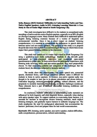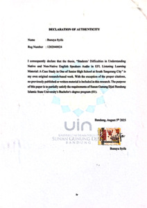 Syifa, Bunaya (2025) Students' difficulties in understanding native and non-native english speakers audio in EFL listening learning material: A case study in One of Senior High School at South Tangerang City. Sarjana thesis, UIN Sunan Gunung Djati Bandung.