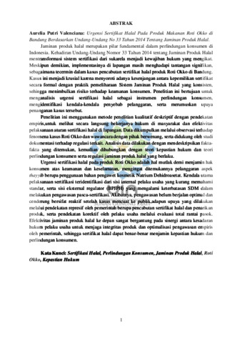 | Uncontrolled Keywords: | Sertifikasi Halal; Perlindungan Konsumen; Jaminan Produk Halal; Roti Okko; Kepastian Hukum |
