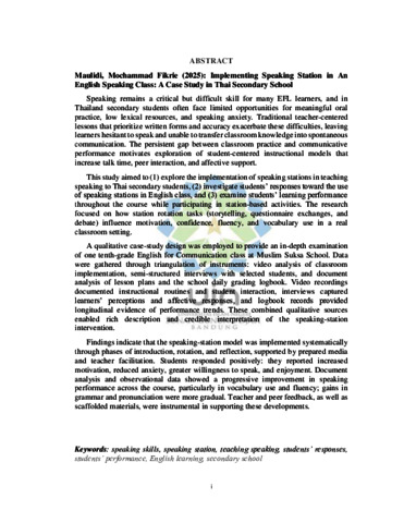 Speaking is a challenging skill for many Thai EFL secondary students due to limited oral practice, low vocabulary mastery, and speaking anxiety in teacher-centered classrooms. This qualitative case study examined the implementation of speaking stations in a tenth-grade English for Communication class at Muslim Suksa School, explored students’ responses, and analyzed their speaking performance during station-based activities involving storytelling, questionnaire exchanges, and debate. Data were collected through classroom video observations, semi-structured interviews, and document analysis to ensure triangulation. The findings showed that speaking stations were implemented systematically and received positive student responses, including increased motivation, reduced anxiety, and greater confidence. Students’ speaking performance improved progressively, particularly in vocabulary use and fluency, indicating that speaking stations effectively support communicative speaking development in EFL classrooms.