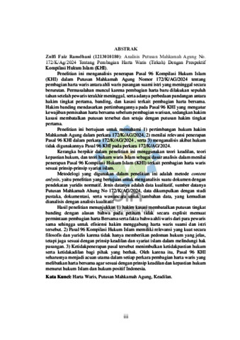 Penelitian ini menganalisis penerapan Pasal 96 Kompilasi Hukum Islam (KHI) dalam Putusan Mahkamah Agung Nomor 172/K/AG/2024 tentang pembagian harta waris antara ahli waris pasangan suami istri yang meninggal secara berurutan. Permasalahan muncul karena pembagian harta baru dilakukan sepuluh tahun setelah pewaris terakhir meninggal, serta adanya perbedaan pandangan antara hakim tingkat pertama, banding, dan kasasi terkait pembagian harta bersama. Hakim banding mendasarkan pertimbangannya pada Pasal 96 KHI yang mengatur kewajiban pemisahan harta bersama sebelum pembagian warisan, sedangkan hakim kasasi membatalkan putusan tersebut dan setuju dengan putusan hakim tingkat pertama. Penelitian ini bertujuan untuk memahami 1) pertimbangan hukum hakim Mahkamah Agung dalam perkara 172/K/AG/2024, 2) menilai relevansi penerapan Pasal 96 KHI dalam perkara 172/K/AG/2024 , serta 3) menganalisis akibat hukum tidak digunakannya Pasal 96 KHI pada perkara 172/K/AG/2024. Kerangka berpikir dalam penelitian ini menggunakan teori keadilan, teori kepastian hukum, dan teori hukum waris Islam sebagai dasar analisis dalam menilai penerapan Pasal 96 Kompilasi Hukum Islam (KHI) terkait pembagian harta waris sesuai prinsip-prinsip syariat islam. Metodelogi yang digunakan dalam penelitian ini adalah metode content anlysis, yaitu penelitian yang bertujuan untuk menganalisis suatu dokumen dengan pendekatan yuridis normatif. Jenis datanya adalah data kualitatif, sumber datanya Putusan Mahkamah Ahung No 172/K/AG/2024, data dikumpulkan dengan studi pustaka, dokumentasi, serta wawancara untuk tambahan data, yang kemudian dianalisis dengan analisis kualitatif Hasil penelitian menunjukkan 1) hakim kasasi membatalkan putusan tingkat banding dengan alasan bahwa pada petitum tidak secara explisit memuat permintaan pembagian harta Bersama serta fakta bahwa ahli waris dari para pewaris sama sehingga untuk efisiensi hakim menggabung harta waris suami dan istri tersebut. 2) Pasal 96 Kompilasi Hukum Islam memiliki relevansi yang kuat secara filosofis dan yuridis karena tidak hanya memberikan pedoman hukum yang jelas, tetapi juga sesuai dengan prinsip keadilan dan syariat islam dalam melindungi hak pasangan. 3) Ketidakpenerapan pasal tersebut menimbulkan ketidakpastian hukum serta ketidakadilan bagi pihak yang berhak. Oleh karena itu, Pasal 96 KHI seharusnya menjadi acuan utama dalam setiap perkara pembagian harta waris yang melibatkan harta bersama agar sesuai dengan prinsip keadilan dan kepastian hukum menurut hukum Islam dan hukum positif Indonesia.