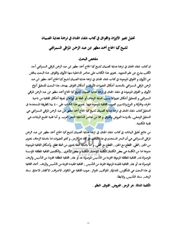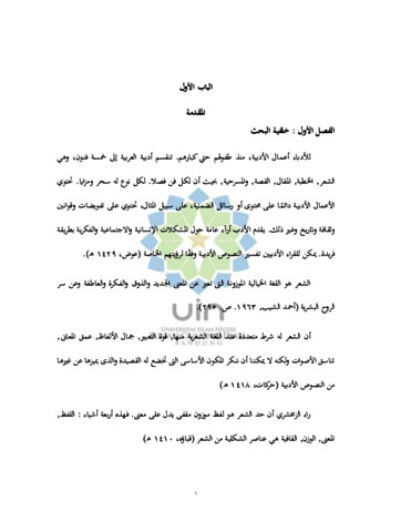 تحليل تغيير الأوزان والقوافى في كتاب شفاء الجنان في ترجمة هداية الصبيان لشيخ كيا الحاج أحمد مطهر ابن عبد الرحمن المراقي السمرانجي ملخص البحث ان كتاب شفاء الجنان في ترجمة هداية الصبيان لشيخ كيا الحاج أحمد مطهر ابن عبد الرحمن المراقي السمرانجي أحد الكتب يشرح عن علم التجويد. يحتوي هذا الكتاب على عناصر الداخلية منها الأوزان والقوافي. هذا البحث يناقش عن الأوزان و القوافي الموجودة في كتاب شفاء الجنان في ترجمة هداية الصبيان لشيخ كيا الحاج أحمد مطهر ابن عبد الرحمن المراقي السمرانجي بالتحديد أشكال التغييرات الأوزان و أشكال القوافي. يهدف هذا البحث للتحليل أنواع الأوزان و القوافى الموجودة في شفاء الجنان في ترجمة هداية الصبيان لشيخ كيا الحاج أحمد مطهر ابن عبد الرحمن المراقي السمرانجي و للتحليل أشكال تغييراتها بسبب اصابة الزحاف أو العلة فى أوزانها و لمعرفة أشكال القافية من ناحية الحرف والحركة و النوع والاسم والعيوب القافية الموجودة فيها. يحتوي هذا الكتاب على ٤٠ بيتا. الطريقة المستخدمة في التحليل كتاب شفاء الجنان في ترجمة هداية الصبيان لشيخ كيا الحاج أحمد مطهر ابن عبد الرحمن المراقي السمرانجي هي التحليل الوصفى بالدراسة العروض والقوافى و هما من عناصر الداخلية الشعر العرب و أما تقنية الجمع البيانات هي تقنية المكتبتية. من نتائج تحليل البيانات في كتاب شفاء الجنان في ترجمة هداية الصبيان لشيخ كيا الحاج أحمد مطهر ابن عبد الرحمن المراقي السمرانجي هي أن البحر المستخدم في هذا البحث هو كله بحر الرجز, وكثير التغييرات اما باصابة الزحاف يحتوى من الخبن الطي, القطع مع الخبن, القطع مع الطي, و اما باصابة العلة يحتوى من العلة قطع. وأشكال القافية الموجودة متنوعة اما من الكلمة هي بعض الكلمة, الكلمة الواحدة, الكلمة و بعض الأخرى, والكلمتين القافية المطلقة المؤسسة الموصولة بمد, القافية المطلقة المردوفة المجردة من التأسيس الموصولة بمد أو بهاء, القافية المطلقة المجردة من التأسيس والردف الموصولة بمد أو بهاء, القافية المقيدة المردوفة المجردة من التأسيس, القافية المقيدة المجردة من التأسيس والردف. أسماء القافية في هذا البحث هي المتكاوس, المتدارك, المتراكب, المتواتر عيوب القافية هي الاقواء, الاصراف, الاكفاء, الاجازة, سناد الردف, سناد التأسيس, والايطا.