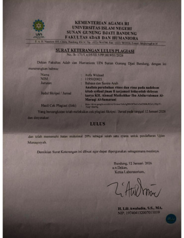 Widad, Aufa (2025) Analisis perubahan ritme dan rima pada nazam kitab Syifaul Jinan fi Tarjamati Hidayatish Shibyan karya KH Ahmad Muthohhar ibn Abdurrahman al-Maraqi al-Samarani. Sarjana thesis, UIN Sunan Gunung Djati Bandung.