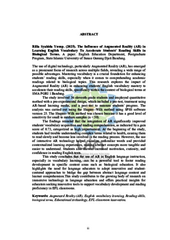 The use of digital technology, particularly Augmented Reality (AR), has emerged as a prominent focus of research across multiple fields, revealing a wide range of possible advantages. Mastering vocabulary is a crucial foundation for enhancing students’ reading skills, especially when it comes to comprehending academic readings related to biological topics. This research explores the impact of Augmented Reality (AR) in enhancing students' English vocabulary mastery to accelerate their reading skills, specifically within the context of biological terms at SMA PGRI 1 Bandung. The study involved 36 eleventh-grade students and employed quantitative method with a pre-experimental design, which included a pre-test, treatment using AR-based learning media, and a post-test to measure students' progress. The analysis was carried out using the Shapiro–Wilk method using SPSS software version 25. The Shapiro–Wilk method was chosen because it has a good level of sensitivity for small to medium samples (n < 50). The findings revealed that the integration of AR significantly improved students' vocabulary acquisition and reading comprehension, as indicated by a gain score of 0.73, categorized as high improvement. At the beginning of the study, students had trouble understanding complex terms related to health, causing them to read slowly and become less involved in the reading process. However, the use of interactive AR technology helped visualize unfamiliar words and provided contextualized learning experiences, making abstract concepts more tangible and easier to understand. Students also showed increased motivation, curiosity, and confidence in reading English texts. This study concludes that the use of AR in English language instruction, especially in vocabulary learning, can be a powerful tool to foster reading development in specific content areas such as biological education. It also highlights the need for language educators to adopt innovative and student-centered approaches to bridge the gap between abstract language content and learner comprehension.This study contributes to the growing body of research on immersive technology in language education and offers practical insights for educators seeking innovative tools to support vocabulary development and reading proficiency in EFL classrooms.